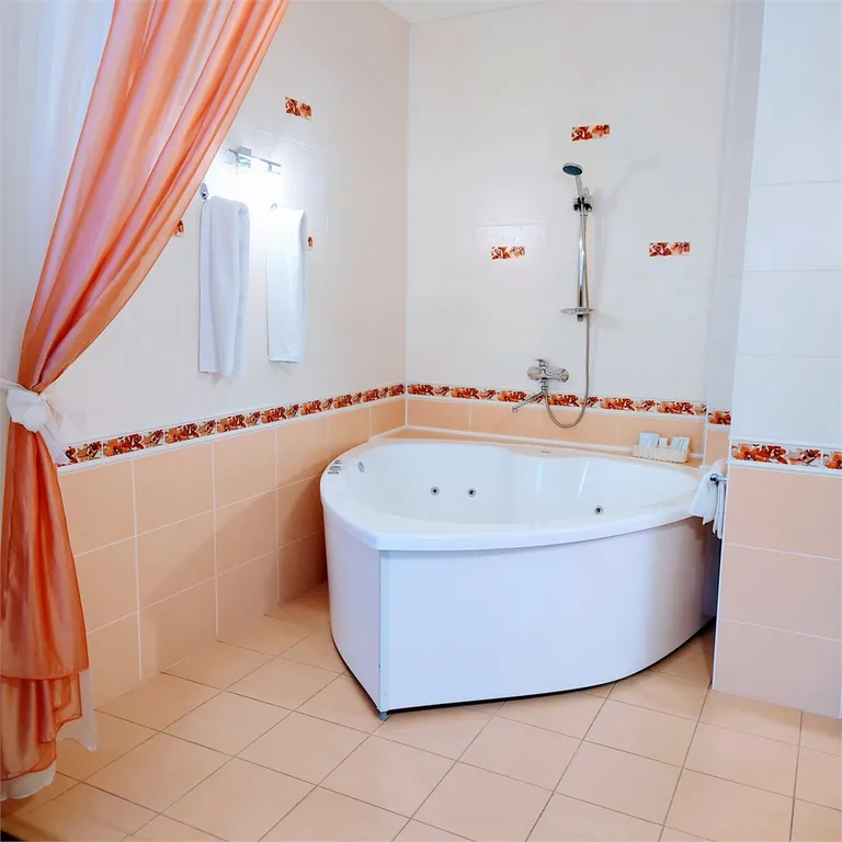 Двухкомнатный номер большой площади оснащен ванной комнатой с джакузи в форме сердца. Из номера открывается прекрасный вид на реку Волгу.