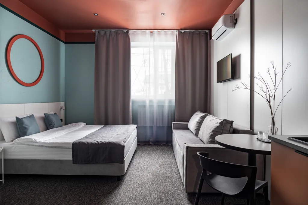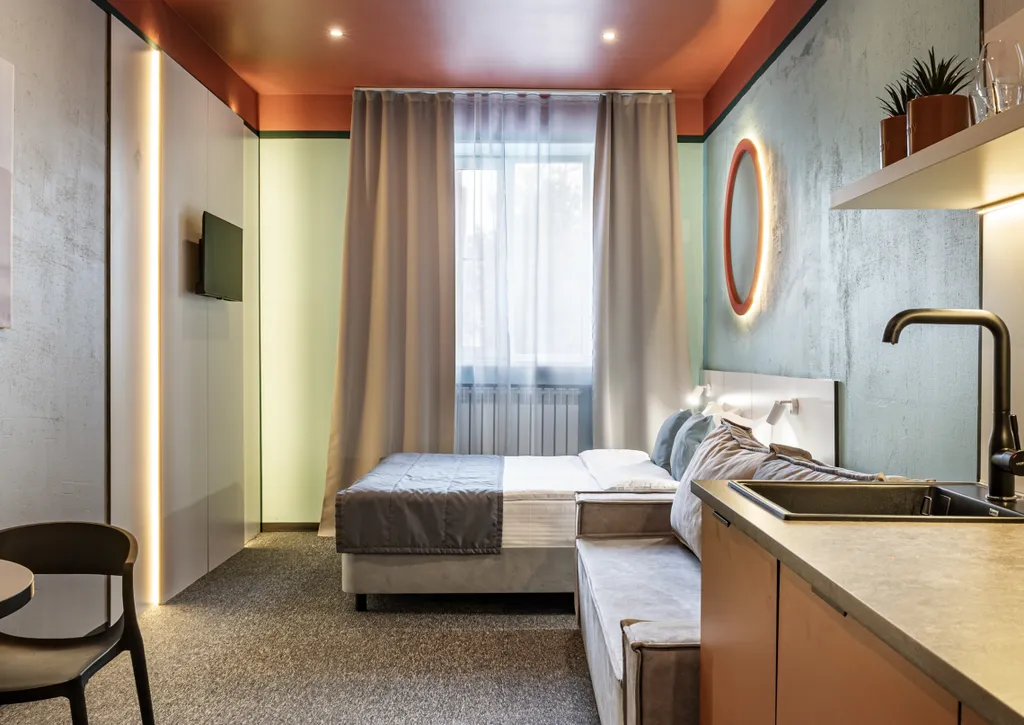 Четырёхместный номер Студия с мини-кухней с двуспальной кроватью и диваном в Костроме - аренда жилья по лучшей цене!